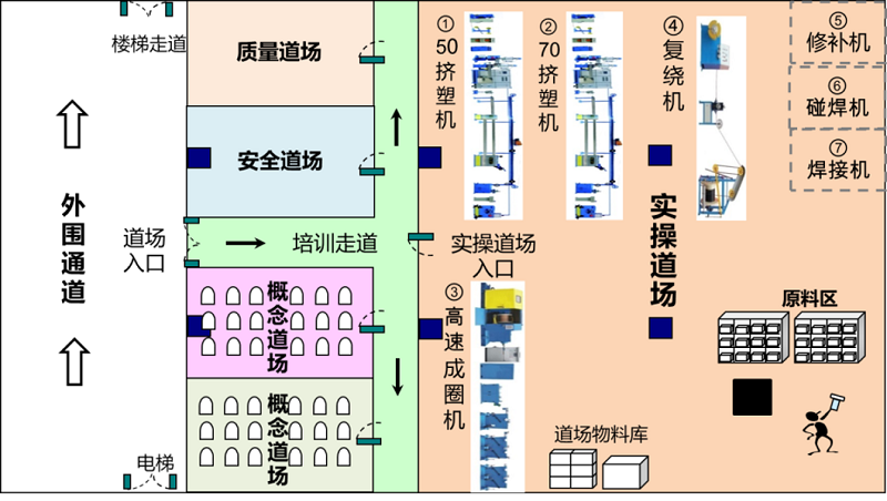 遠(yuǎn)東大學(xué)生產(chǎn)學(xué)院致力于打造行業(yè)內(nèi)首家一線員工實(shí)訓(xùn)道場,道場分為概念道場、安全培訓(xùn)區(qū)、質(zhì)量培訓(xùn)區(qū)及精益實(shí)操道場四大培訓(xùn)區(qū)域,旨在為公司培養(yǎng)具有發(fā)現(xiàn)問題、改善問題的能力、并掌握高水平實(shí)操技能的員工。概念道場即理論培訓(xùn)道場,以傳統(tǒng)課堂式、案例研討式、課題式等培訓(xùn)方式,對參訓(xùn)學(xué)員從思想認(rèn)知方面進(jìn)行工藝?yán)碚摰戎R(shí)的教學(xué);安全道場結(jié)合人、機(jī)、料、法、環(huán),設(shè)計(jì)危險(xiǎn)源識(shí)別及預(yù)防相關(guān)道具,通過安全事故案例進(jìn)行安全教育;質(zhì)量道場以質(zhì)量事故案例警示教育和質(zhì)量問題產(chǎn)品展示為主,通過系統(tǒng)性的質(zhì)量培訓(xùn),培養(yǎng)員工的質(zhì)量意識(shí),提高員工對產(chǎn)品缺陷的識(shí)別能力;精益實(shí)操道場主要通過情景模擬教學(xué)形式,以道場內(nèi)的設(shè)備進(jìn)行設(shè)備維護(hù)、自主保養(yǎng)、快速換模、標(biāo)準(zhǔn)化作業(yè)等培訓(xùn)內(nèi)容,是員工理論培訓(xùn)與實(shí)際操作相結(jié)合的堅(jiān)實(shí)平臺(tái)。